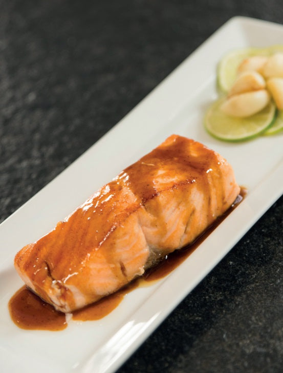 Až bude losos osmažený, naneseme teriyaki omáčku na obě strany a ještě 2–3krát dopékáme.